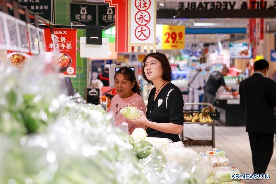 10월 15일 장쑤(江蘇)성 타이싱(泰興)시의 한 마트에서 채소를 고르는 고객. (사진/신화통신)