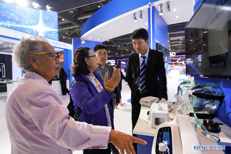 참관객들이 7일 CIIE 의료기기 및 의약보건 전시구역 필립스 부스에서 수평형 양압 환기 장치를 알아보고 있다. (사진/신화통신)