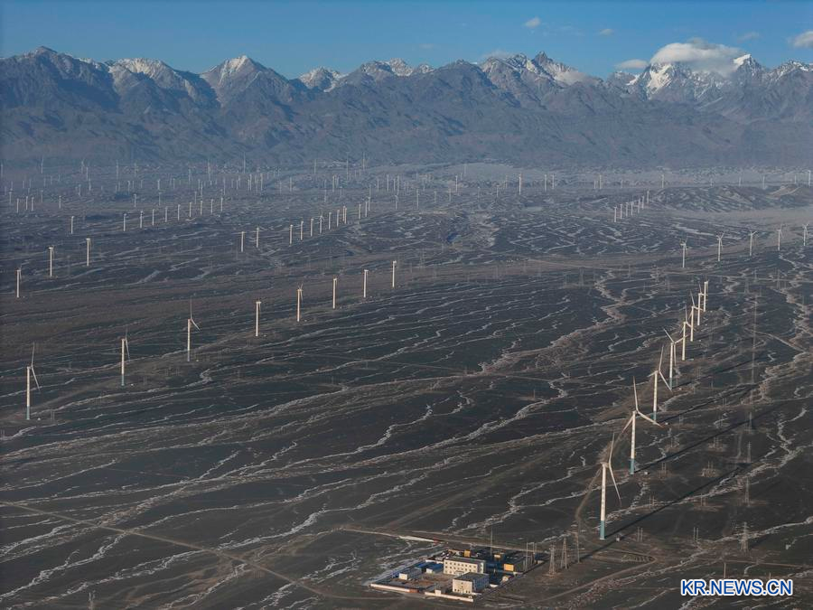 지난해 12월 28일 신장(新疆)의 다반청(達坂城) 구역에 즐비한 풍력발전 블레이더를 드론으로 촬영했다. (사진/신화통신)
