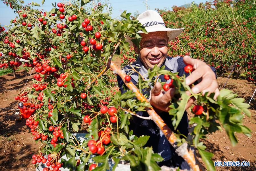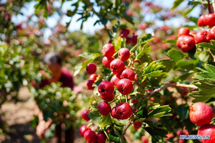 25일 산사 열매 수확에 분주한 류두진 주민. (사진/신화통신)