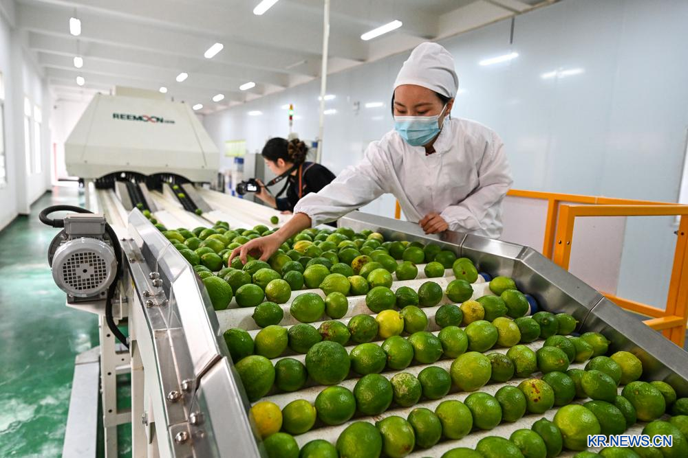 16일 구이저우(貴州)성 왕모(望謨)현 저샹(蔗香)진에 있는 라임현대산업단지 생산 작업장에서 라임 선별 작업이 한창이다.